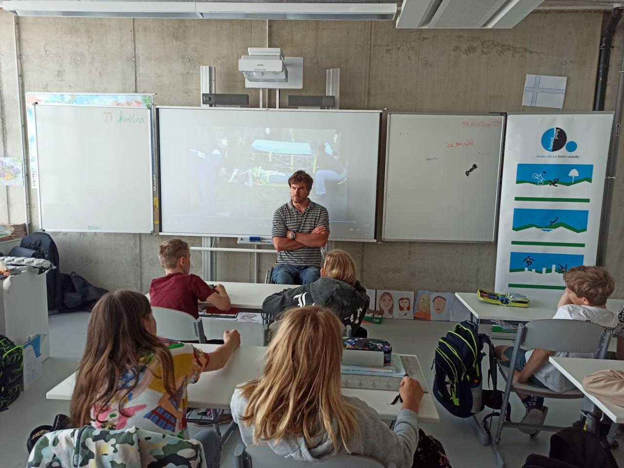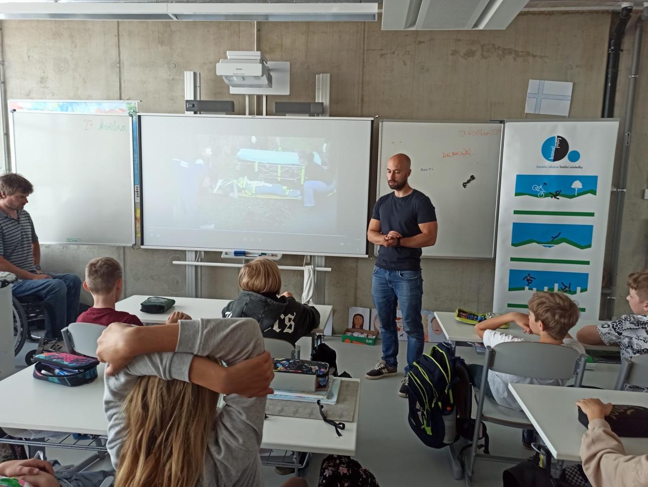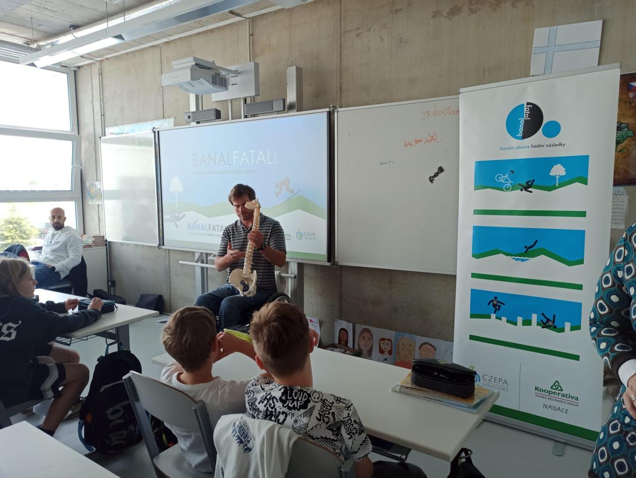 Dne 29.5.2024 navštívila třídu 5.A návštěva s tématem "Banal - fatal". Šlo o besedu o předcházení vážným úrazům. Přijel dokonce pán na vozíku a vyprávěl svůj příběh. Po besedě následovala diskuze s otázkami. Vyučující na to navázali v hodině, kde žáci psali text na téma: Co by se stalo, kdybych..