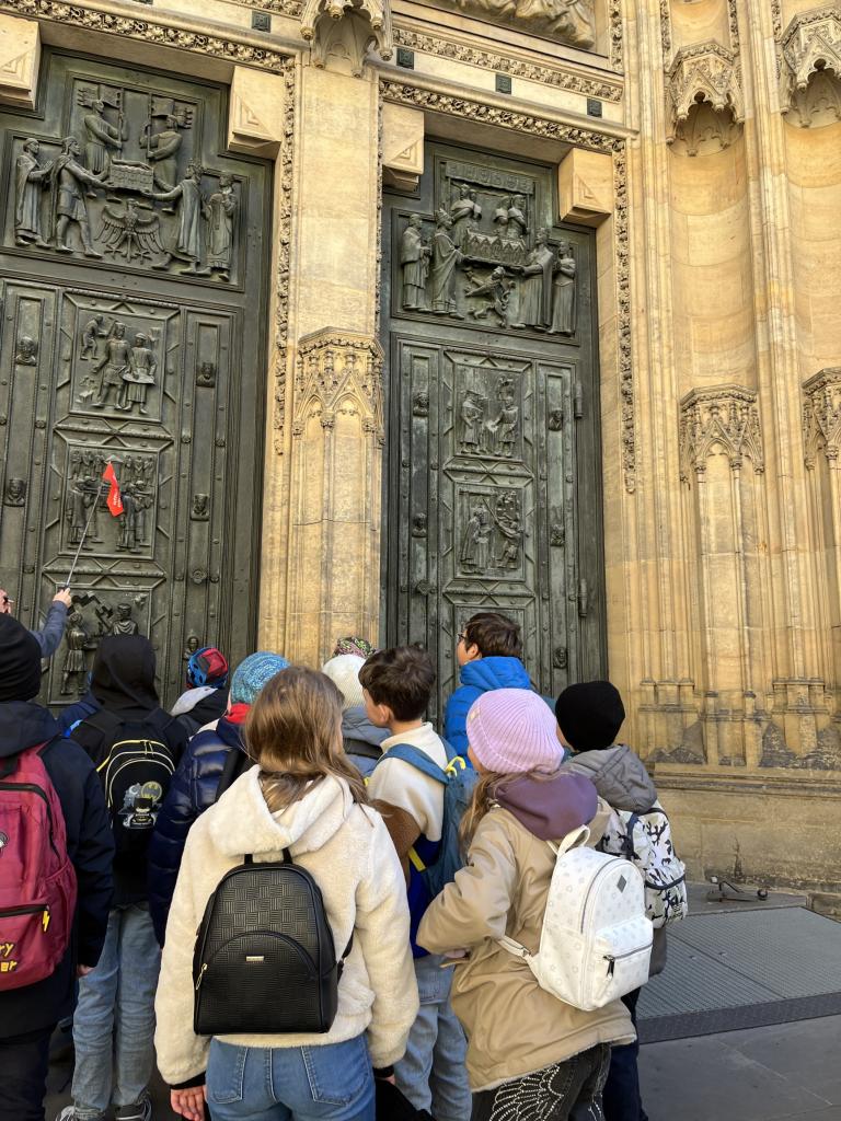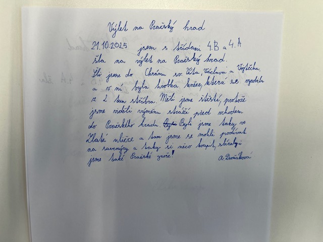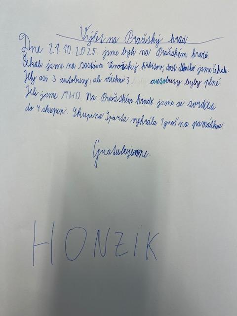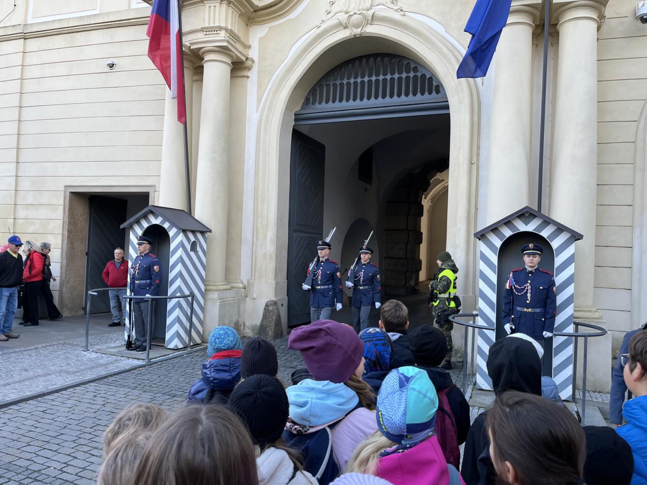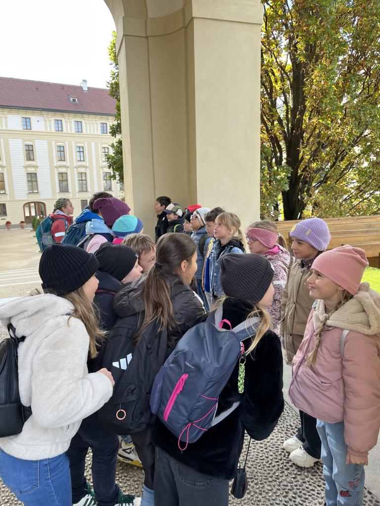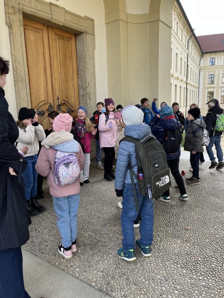 Dne 21.října 2025 jsme byli s žáky 4.B a 4.A na Pražském hradě. Společně jsme tam dorazili pomocí MHD, autobusem, metrem a tramvají. A to už byl pro nás zážitek! Hned u vstupu do Pražského hradu nás přivítaly průvodkyně, které nám prezentovaly zajímavé informace o různých stavbách Pražského hradu, např. o Chrámu sv. Víta, Zlaté uličce a jednotlivých nádvořích. Také jsme mohli vidět výměnu čestné stráže. Žáci během výkladu soutěžili o pražské groše, které si nakonec sečetli a vítězové získali odměnu. Naše exkurze byla velmi úspěšná.